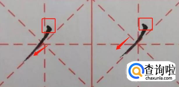 1.短撇,几乎没有弧度,以右侧45度的虚线为参照,撇的倾斜程度比该虚线略平一些;
