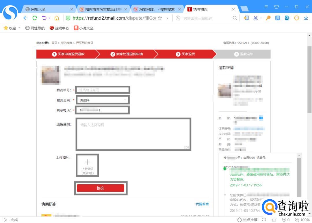 然后我们将物流单号、物流公司、联系电话、退货说明填好之后点击【提交】即可。