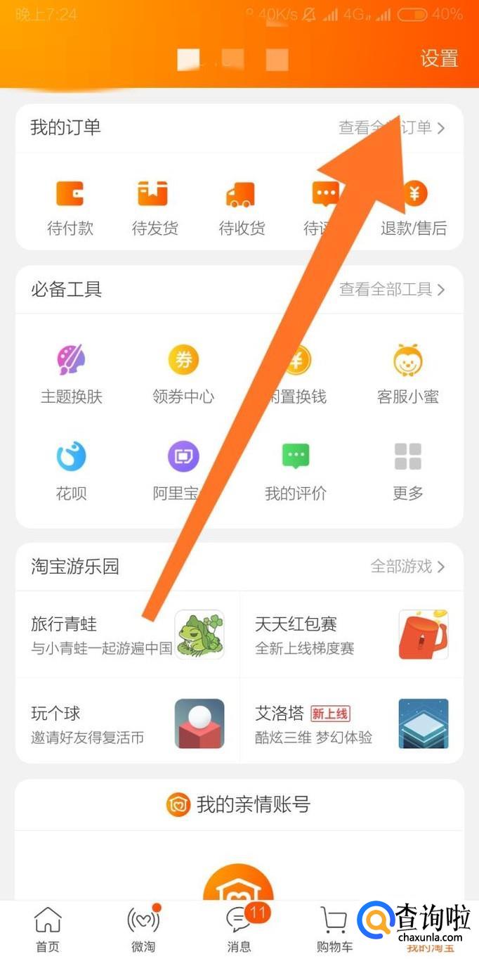 首先进入手机淘宝页面“我的淘宝”,然后点击右上角的“设置”字样。
