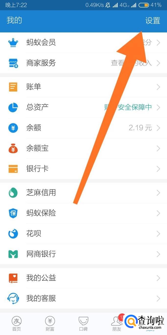 首先进入支付宝页面“我的”,然后点击右上角的“设置”字样。