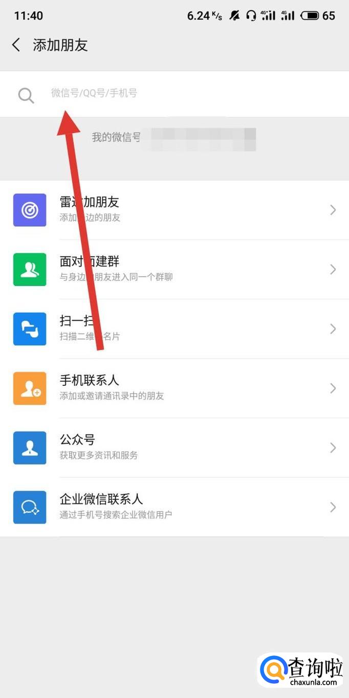 进入之后,在图示位置输入好友的微信号或QQ号或手机号,如图所示。