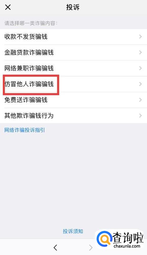 选择更详细的投诉理由,这里我们以选择“仿冒他人诈骗骗钱”为例。