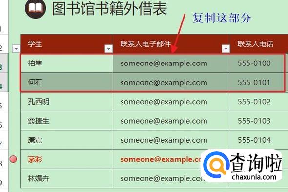 最常规的方法就是新建一个表格,然后手动将我们要打印的内容复制粘贴到新表格中,如下图是一张书籍外借表,假如我们只需打印前两名和后两名同学的借书信息,那么分别复制这四位同学的信息...