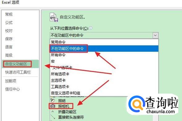 最后一种方法就是通过照相机,不过Excel里面的照相机也属于隐藏功能,我们需要点击“文件”-“选项”,然后在Excel选项里找到“不再功能区中的命令”,在下方即可看到照相机图标,如图一;