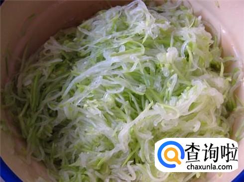 瓠子清洗干净,很嫩的瓠子不用去皮的,直接擦成细丝,加一点点盐腌制一下,将水分挤干净待用。