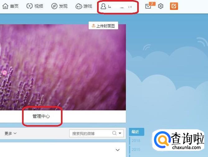 之后就进入微博首页了,我们点击个人账户名,如图所示,进入个人中心,然后点击“管理中心”。