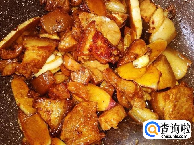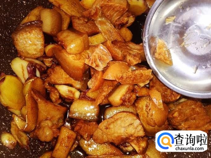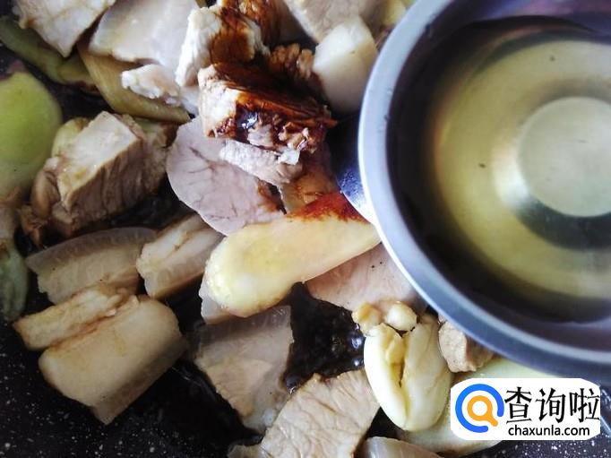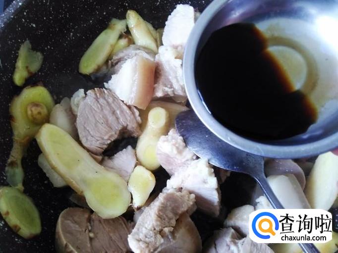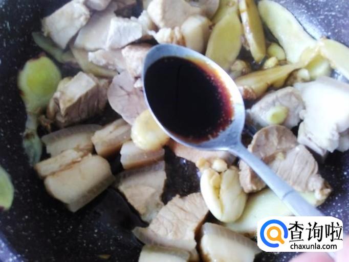 然后放五花肉进去,加1勺生抽、几滴老抽。