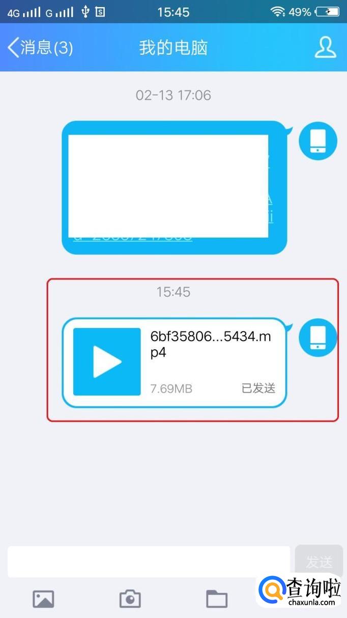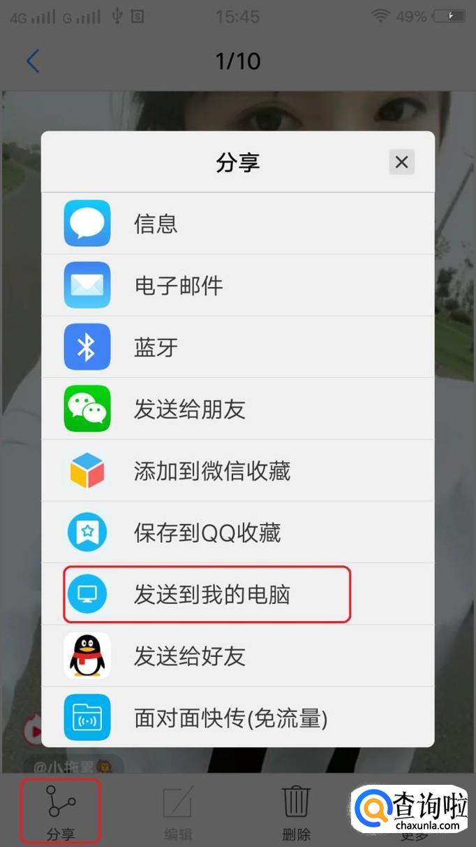 下载完成之后,我们打开手机相册,找到该视频文件,点击左下角“分享”,会弹出如图所示的菜单,我们选择“发送到我的电脑”。发送完成之后,出现如下界面。