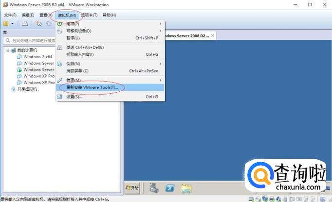 如图所示,唤出"Windows Server 2008 R2 x64"用户界面。点击菜单栏"虚拟机"标签,弹出下拉菜单选择"重新安装VMware Tools..."项。