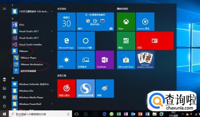 如图所示,拖动右侧垂直滚动条。展开"V→VMware"文件夹,点击"VMware Workstation"项。