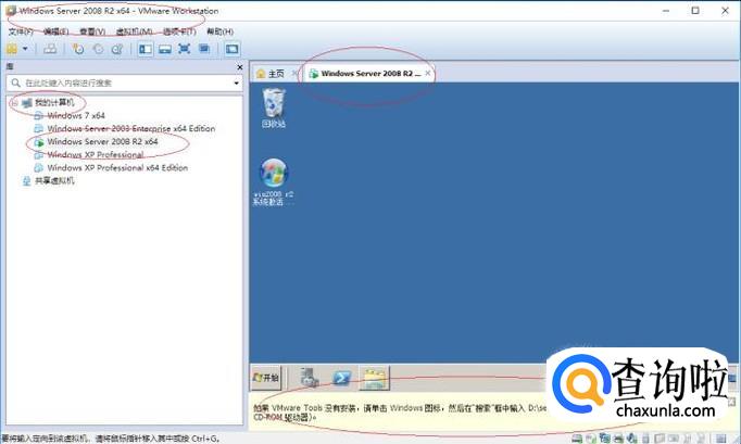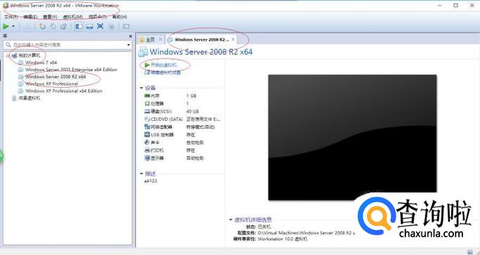唤出"VMware Workstation 10"程序窗口,如图所示。选择"Windows Server 2008 R2 x64"标签,点击"Windows Server 2008 R2 x64→开启此虚拟机"按钮。