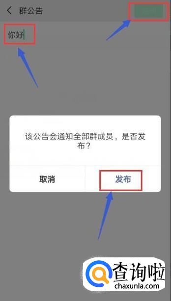 然后,我们在群公告界面的空白处编辑好你要通知全体人的文字,比如“你好”,点击完成,在弹出的对话框点击“发布”,如图所示。