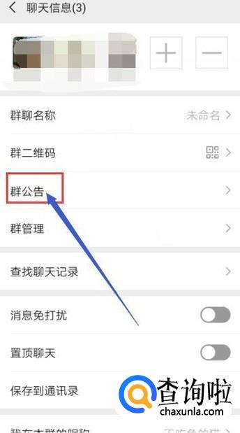 这时候,会打开聊天信息界面,然后我们在这个界面找到“群公告”,并且点击它。