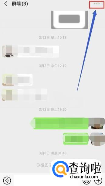 微信群进入后,接着,我们点击右上角的三个点图标,如图所示。