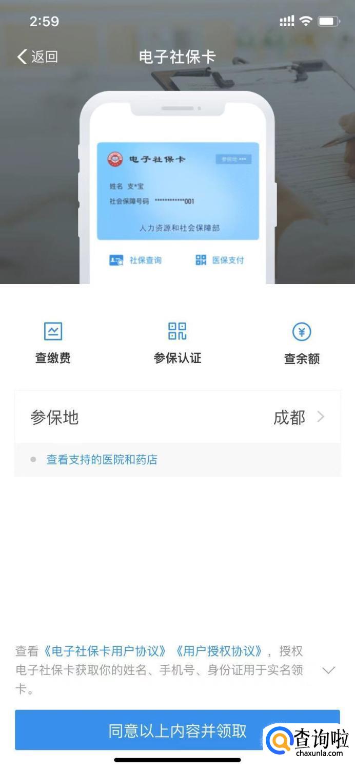 电子社保卡业务会申请支付宝的授权,这里点击“同意以上内容并领取”。