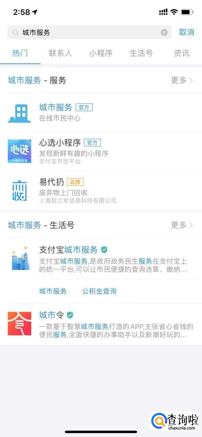 首先进入支付宝首页,点击上方的搜索框,输入“城市服务”进行搜索。