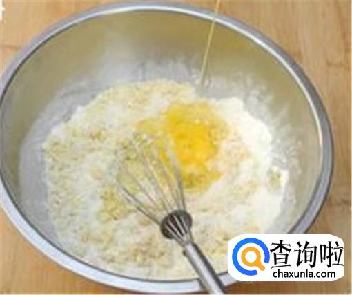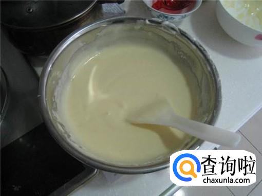 然后,我们就要将酸奶、面粉、蛋黄、奶油一起倒入不锈钢盆中,慢慢搅拌均匀即可。