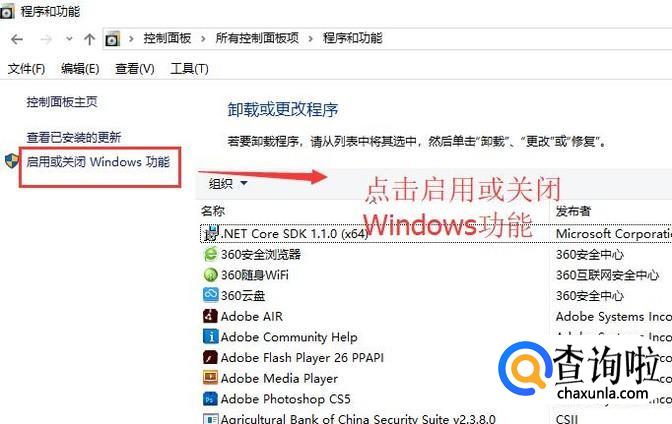 然后在程序和功能界面中我们点击启用或关闭Windows功能选项,如下图所示