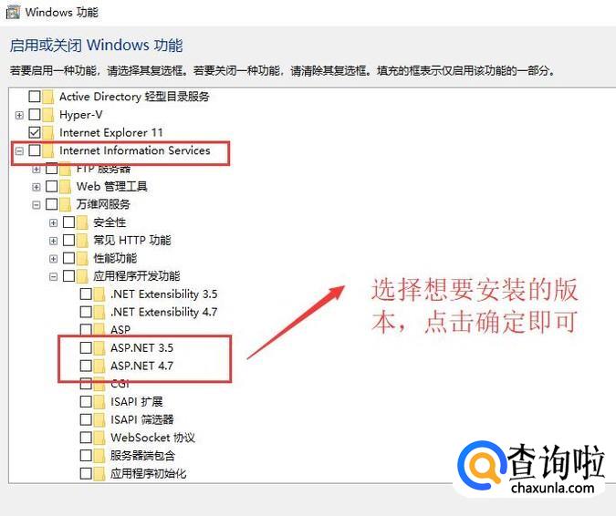 在弹出的Windows功能界面中,我们找到Internet Information Services选项下面的应用程序开发功能,这里大家可以选择相应的ASP.NET版本,勾选以后点击确定就会自动安装IIS了,如下图所示