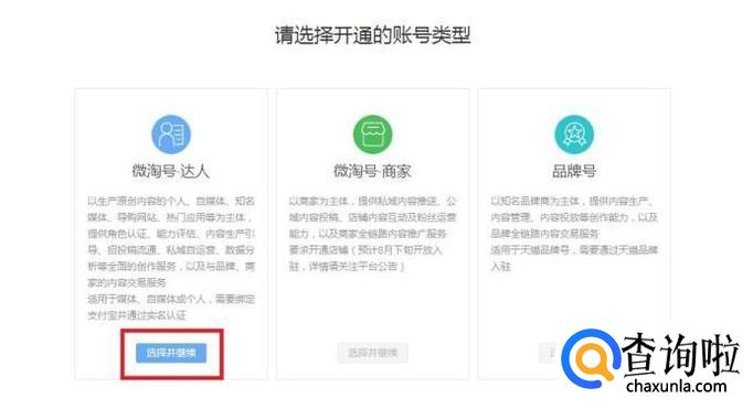账号类型认证通过后,选择开通账号类型,此项系统默认选择“微淘号*达人”,点击“选择并继续”,如图所示