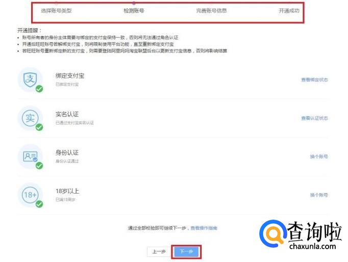 登录成功后,根据系统提示进行账号开通,首先需要选择账号类型,此项基本适合旺旺号一样的,认证通过直接点击下一步即可,如图所示