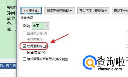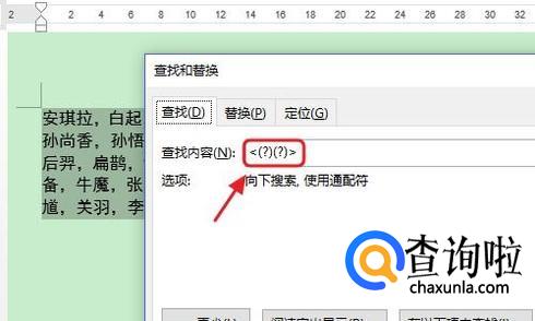 然后按照快捷键Ctrl+H切换出"查找和替换"对话框,在查找输入框我们输入“<(?)(?)>”注:全部为半角输入时的符号,然后点击该对话框左下角的“更多”,勾选其中的“使用通配符”,如图所示...
