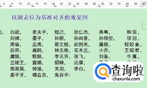 然后文档的上方就会弹出标尺以及类似L形的制表位,我们也可以通过鼠标拖动的方法确定制表位位置,接着我们将光标定位在名字的前面,点击Tab键以后文字就会自动以制表位为基准对齐,效果如下图二...