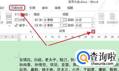 不过这种方法不是太精确,因为如果里面的文字大小不一样,或者说超过三个字以后就不管用了,这时我们就要用到下一种方法了,它就是“制表位”,如何找到制表位呢?如下图依次点击“页面布局”-“段落设置”;