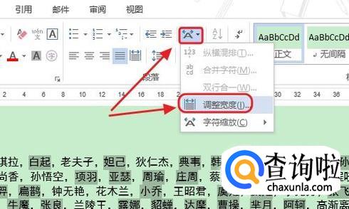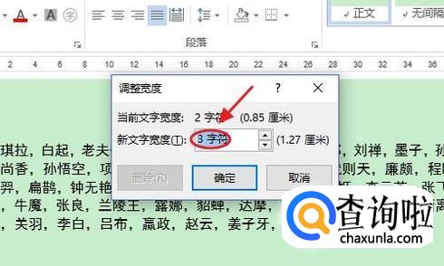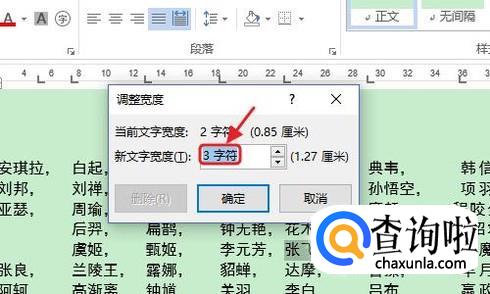 接着我们点击工具栏的“中文版式”-“调整宽度”,由于目前文档中最多的就是3个字符,所以我们将宽度设置为3即可,点击确定以后,之前的文字就对齐了,效果如图三...