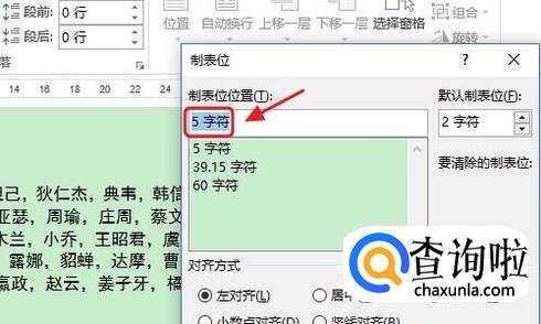然后在弹出的段落对话框左下角就能看到“制表位”选项,如图一;然后我们需要设置一个制表位的位置,这个要根据字长来定,一般名字的话最多四个字,所以我们设置为5字符即可;