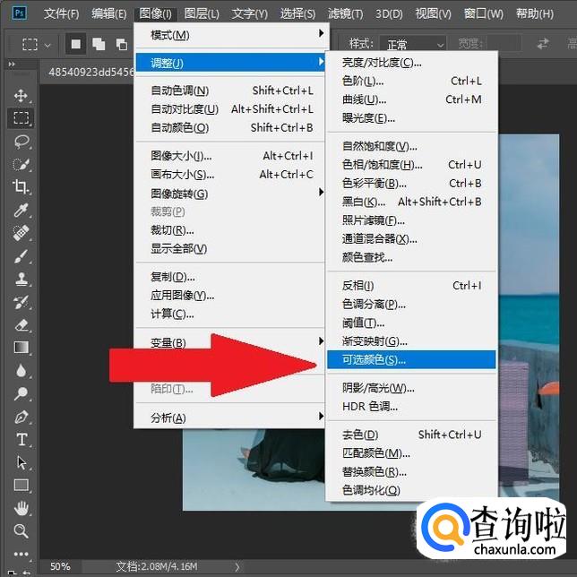 再点击“图像”菜单中的“调整”,接着点击进入“可选颜色”。