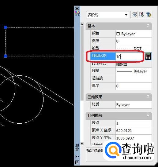 如图所示,在特性面板中就可以修改线型比例了。比如,我们把比例改大成100看看效果。