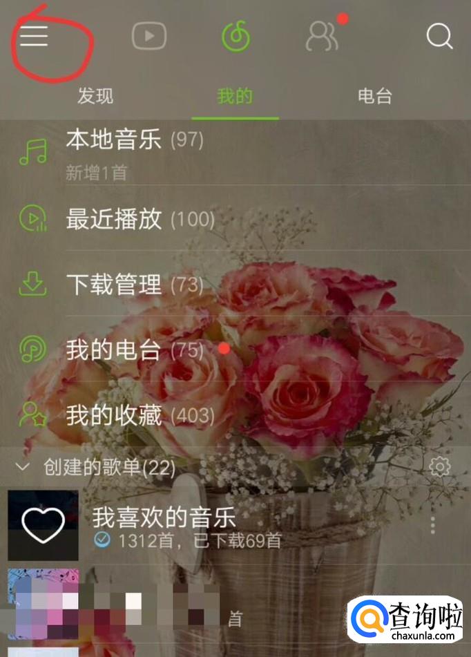 在网易云音乐界面点击左上角三条直线的图标,如下图所示。