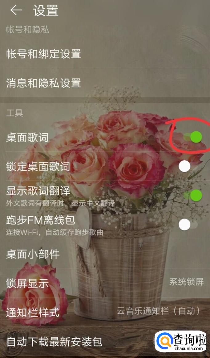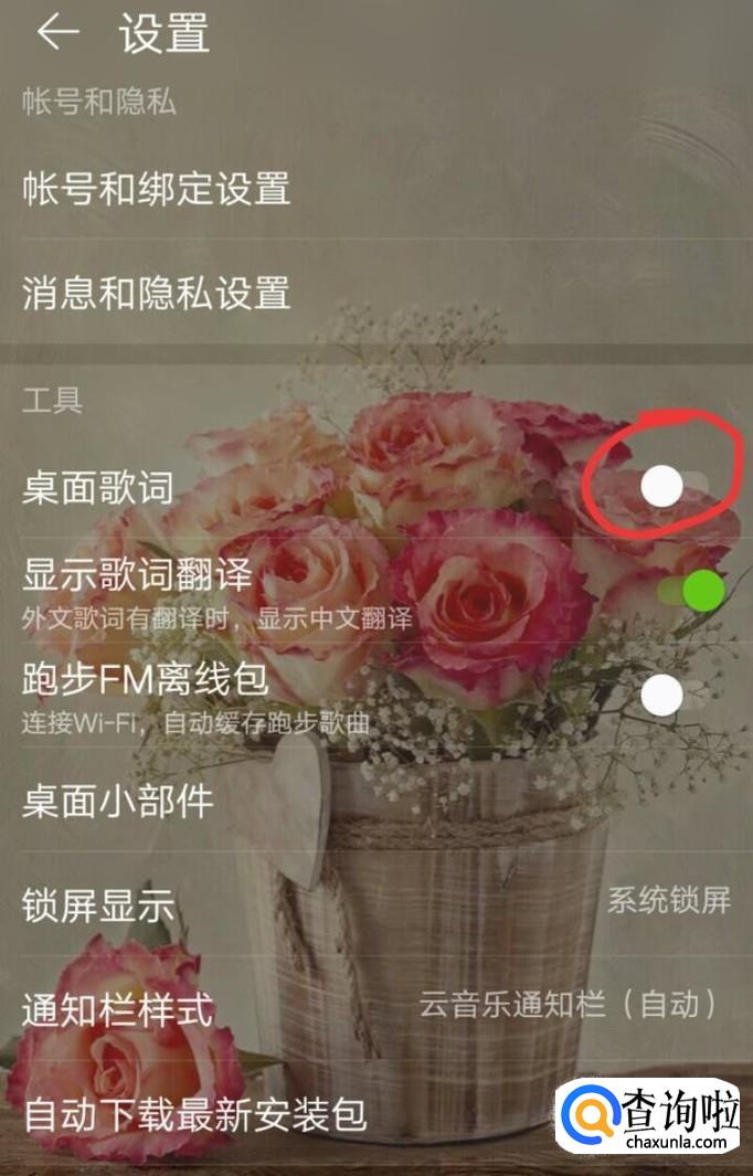然后在设置中下滑找到桌面歌词,会看到桌面歌词是关闭的状态,打开右边的开关。