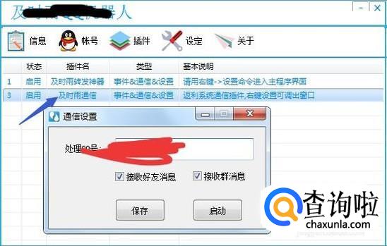 登录后点击插件里的设置,这时会弹出一个窗口,选择接受好友和群消息,保存后点击启动。