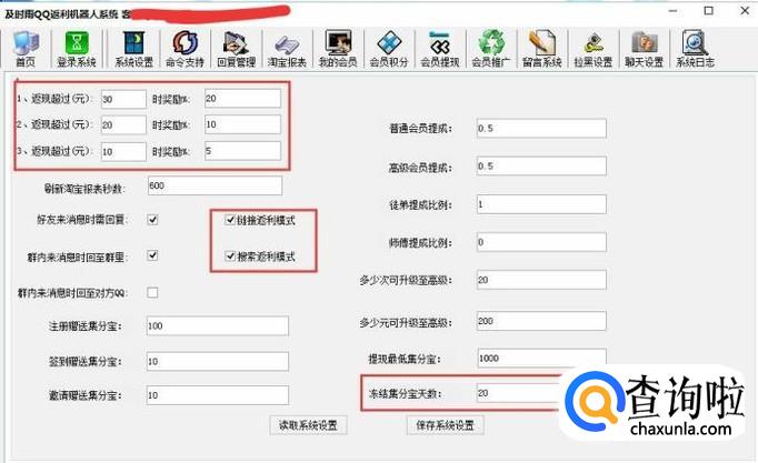 登录后进入返利机器人的主页面,点击上面的系统设置,把返利条件设置清楚,再保存系统设置。