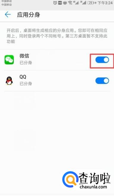 弹出的界面,我们将微信的分身开关向右滑动,从而将微信进行分身,之后我们就可以登录两个微信了。