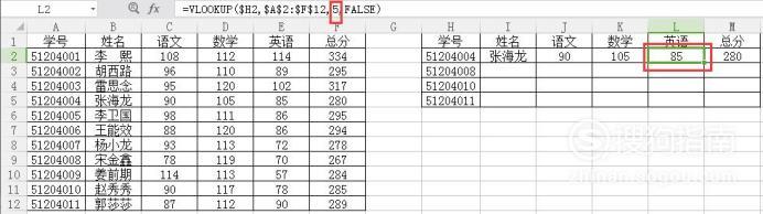 实例公式(L2):=VLOOKUP($H2,$A$2:$F$12,5,FALSE)