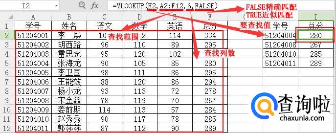 实例公式:=VLOOKUP(H2,A2:F12,6,FALSE)
