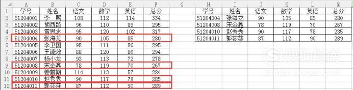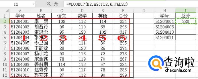 之后的“语文”第3个参数改为“3”,“数学”第3个参数改为“4”,“英语”第3个参数改为“5”,“总分”第3个参数改为“6”。