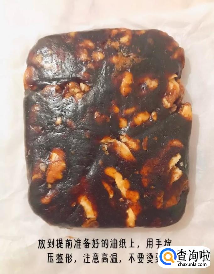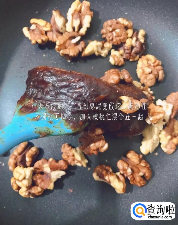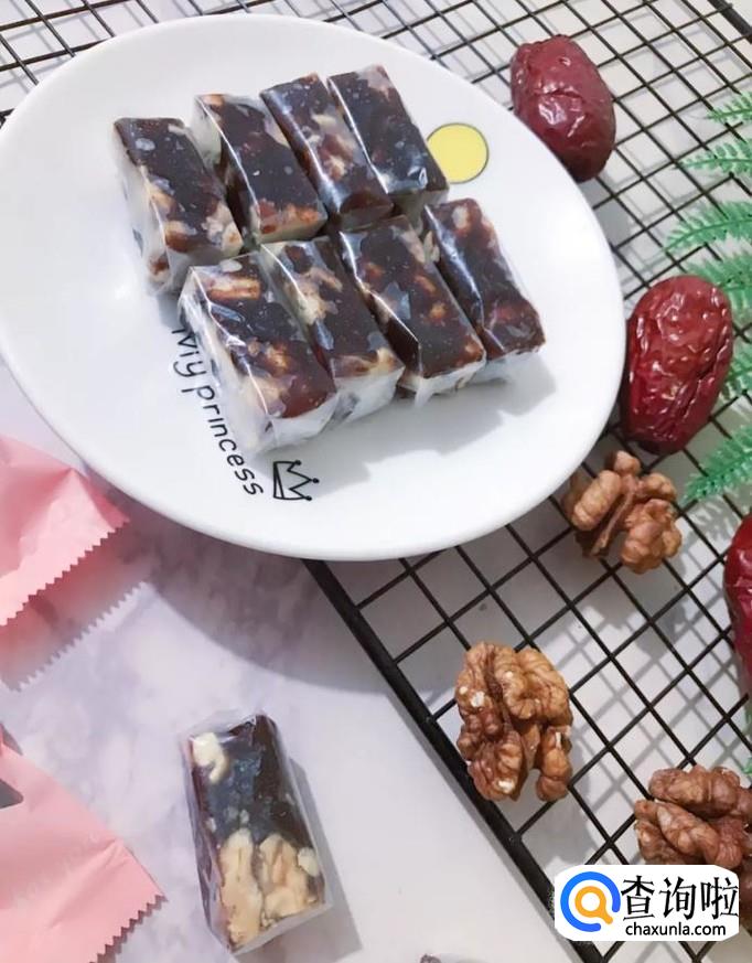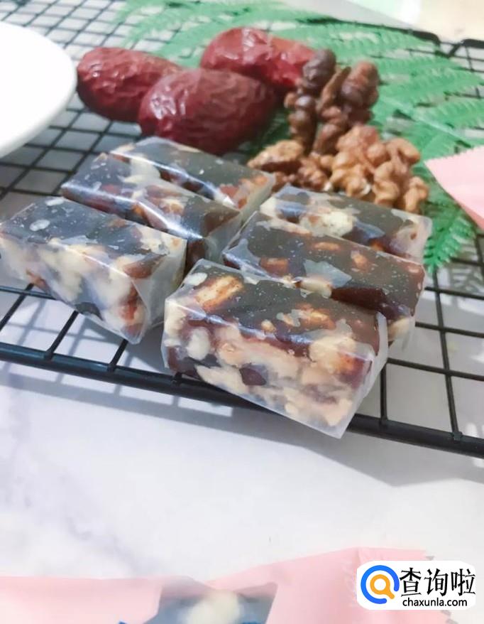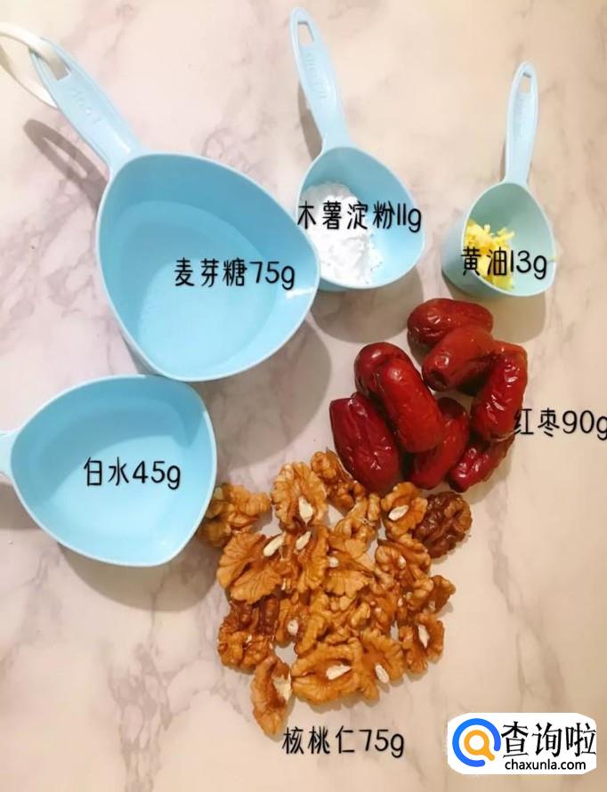 食材:麦芽糖75克,木薯粉11克,黄油13克,红枣90克,核桃仁75克,清水45克。