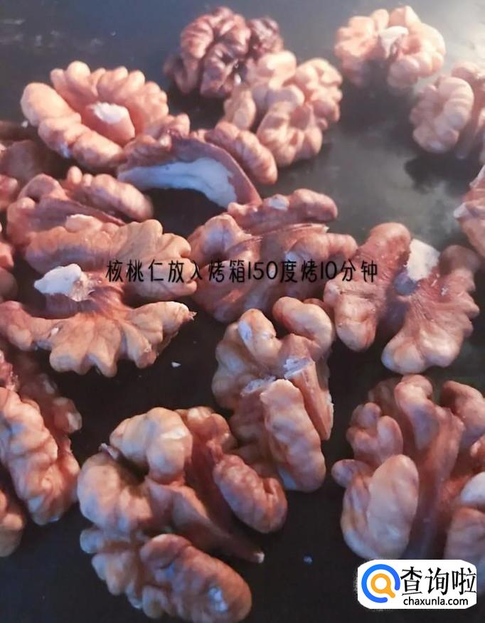 首先将核桃仁放入烤箱,150°火烤十分钟,如下图所示。