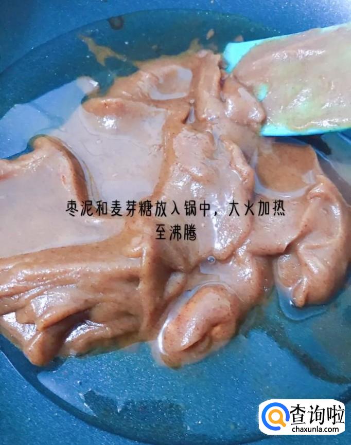 然后将枣泥和麦芽糖放入锅中,用大火加热至沸腾,如下图所示。