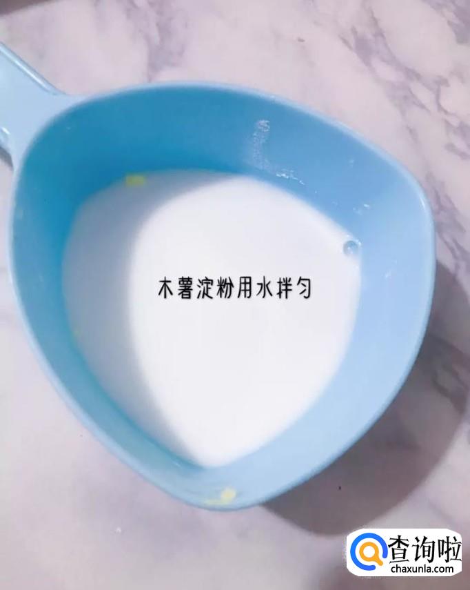 接着把木薯淀粉用水搅拌均匀,如下图所示。