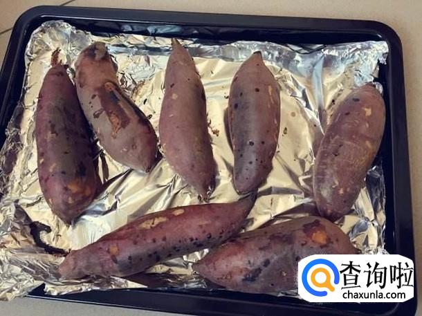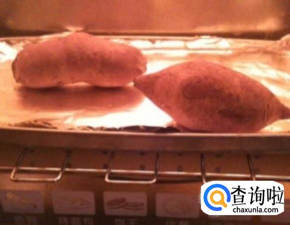 取适量洗净的蜜薯,放入烤盘,烤盘下面最好垫上锡纸,蜜薯一次不要放太多,放太多,中间留空隙大些熟的透。