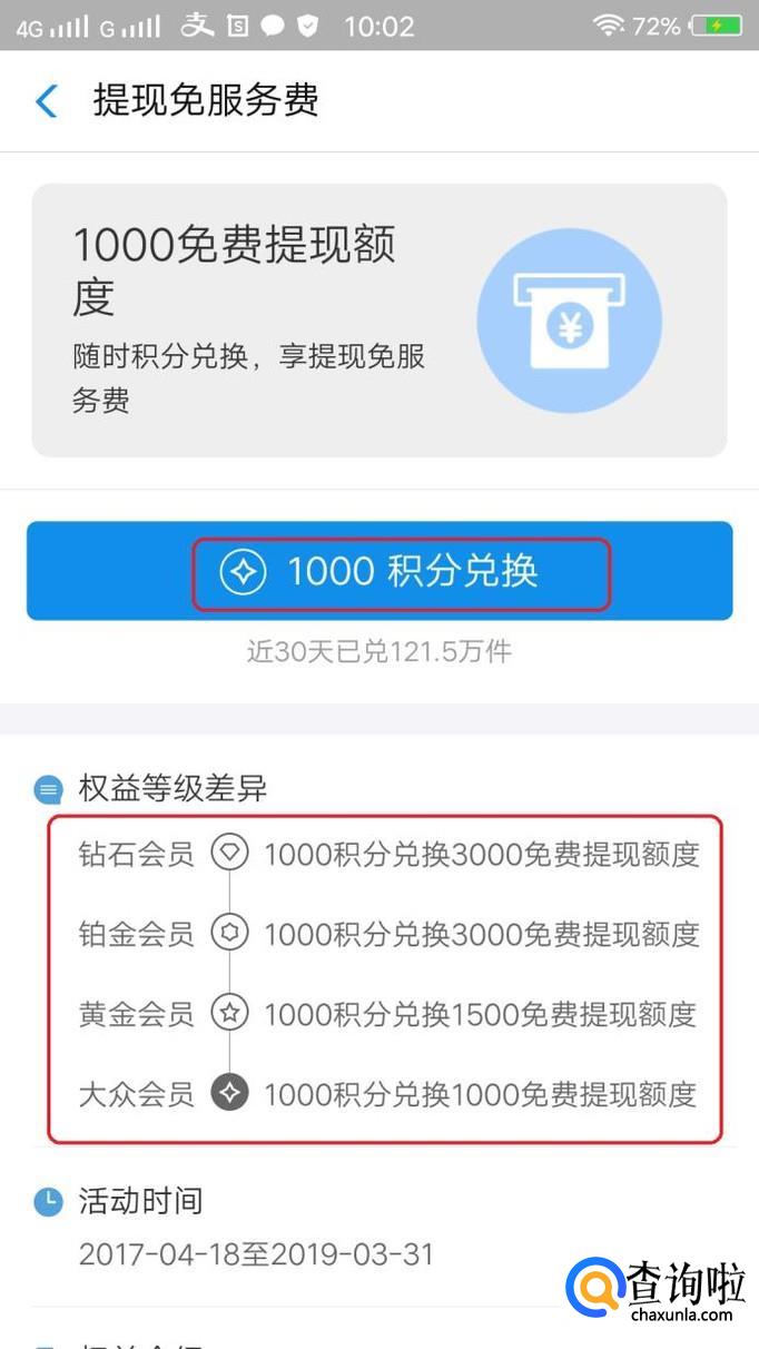 可以看到,大众会员是1000积分兑换1000免费提现额度,如果要提高提现额度,就要升级会员等级,如图所示。