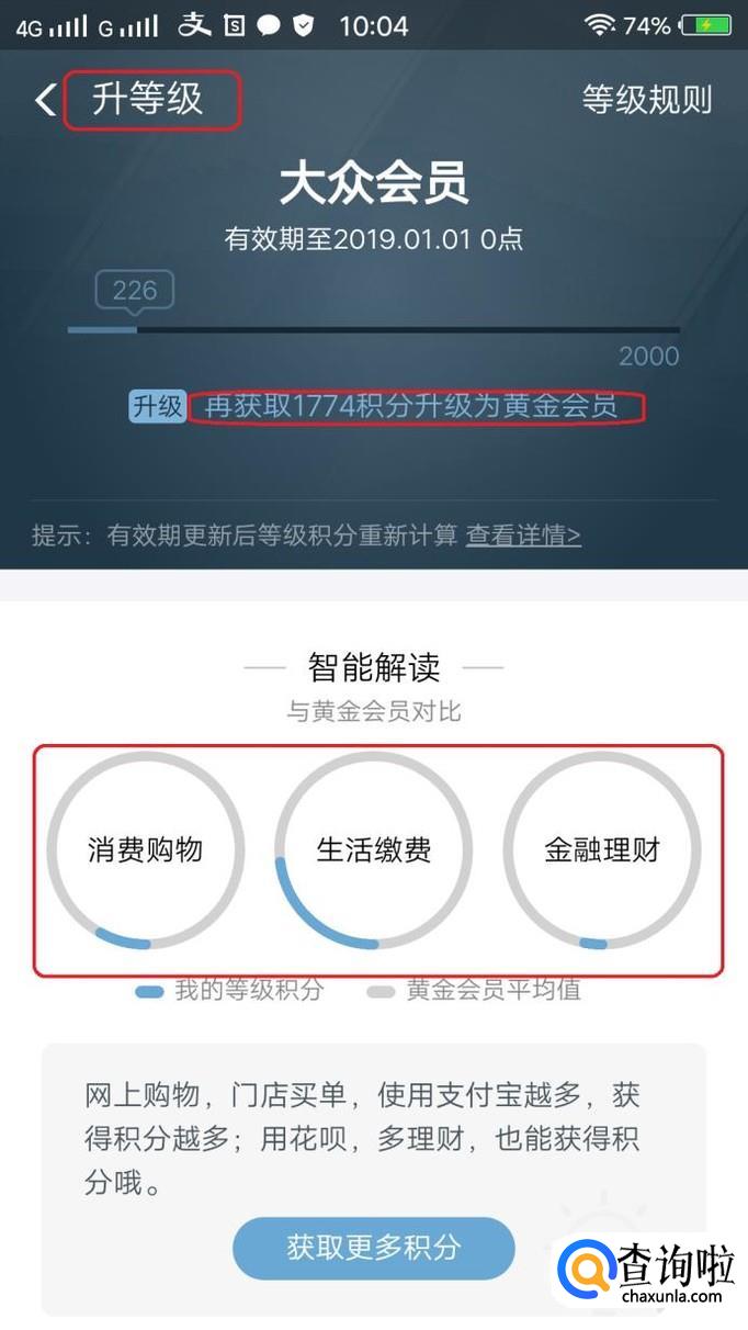 升等级可以通过用支付宝网上购物、生活缴费、理财等方式来达到,总的来说,就是多用支付宝,多攒积分。