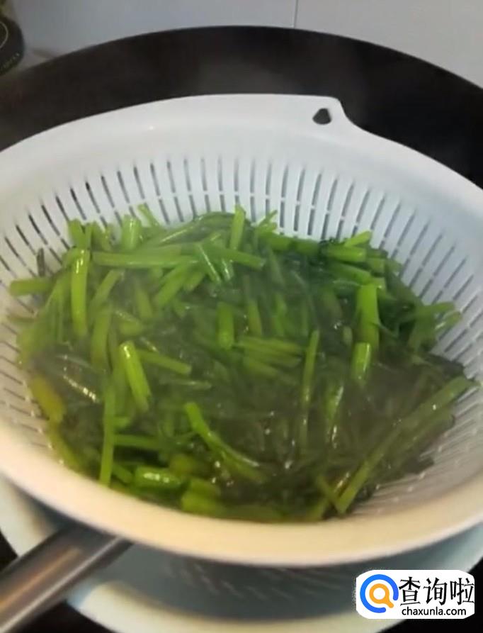 然后我们起锅烧油,油热先放入茼蒿杆,煸炒两下,再放入茼蒿叶,烧熟以后捞出,控干水分备用
