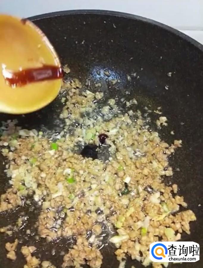 接着我们起锅烧油,放入肉末炒香,再放入葱姜蒜末,加入适量的蚝油,酱油,十三香,盐,鸡精调味翻炒均匀