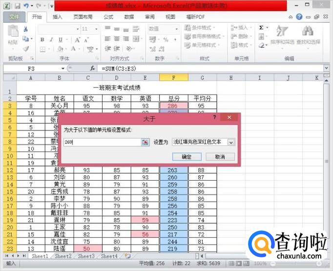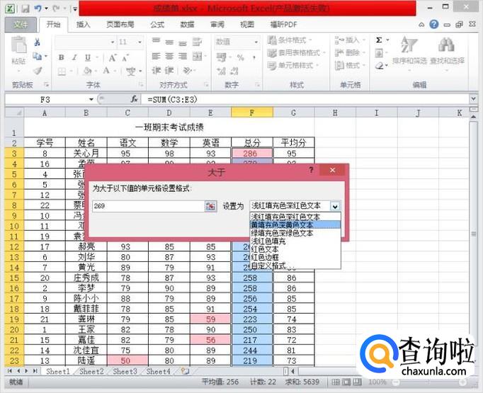 在弹出的对话框中输入值”269“(注意:我们的数据是整数,此时的条件是>269,即>=270)